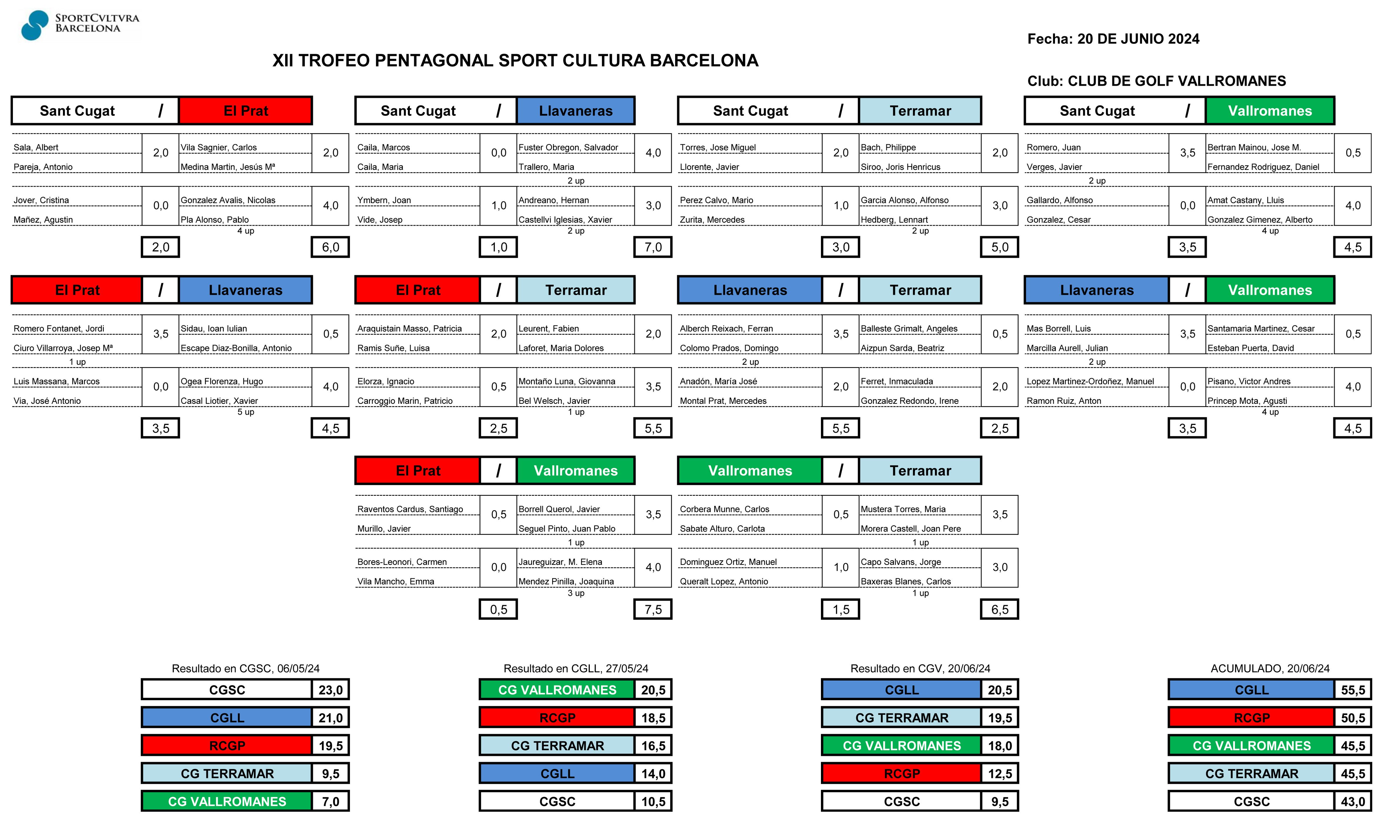 Los cinco clubes de golf miembros de SCBCN jugaron la XII edición del Trofeo Pentagonal Sport Cultura Barcelona. El torneo, que comenzó el 6 de mayo y finalizó el 11 de noviembre, se jugó en la modalidad Fourball Match Play Handicap, y jugaron 8 parejas por club, es decir, un total de 80 jugadores.