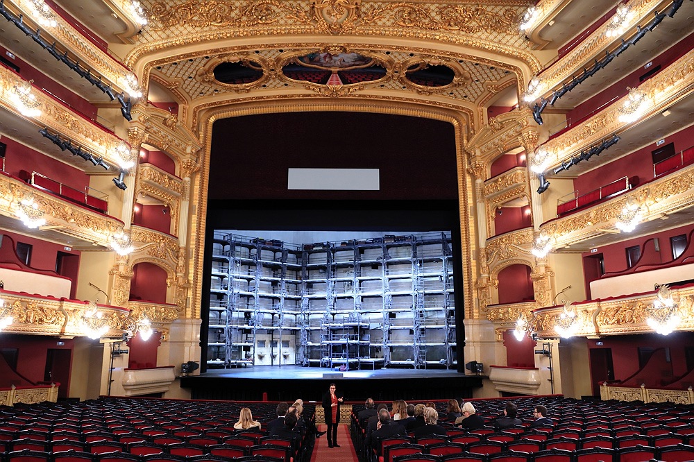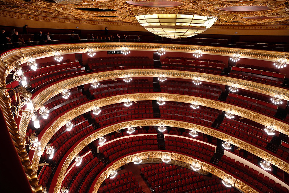 Sala - Una sala “alla italiana” impresionante por sus dimensiones, un compendio de tradición e innovación, con un aforo de 2.292 personas. A raíz del incendio de 1994, fue reconstruida muy fielmente, en sentido decorativo, pero con todos los avances técnicos del siglo XX, e inaugurada de nuevo el 7 octubre de 1999.
