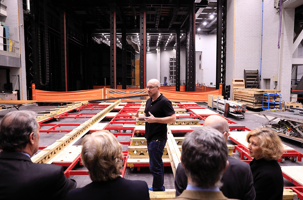 Backstage y nivel inferior– Acompañados de uno de los jefes de escenario del Liceu se recorrieron los 5 niveles que existen entre el escenario principal y el nivel inferior. Explicó detalladamente el funcionamiento de las plataformas que hay instaladas que permiten la alternancia de diferentes escenarios para los espectáculos programados durante la temporada -de dos a tres diferentes en una misma semana-.