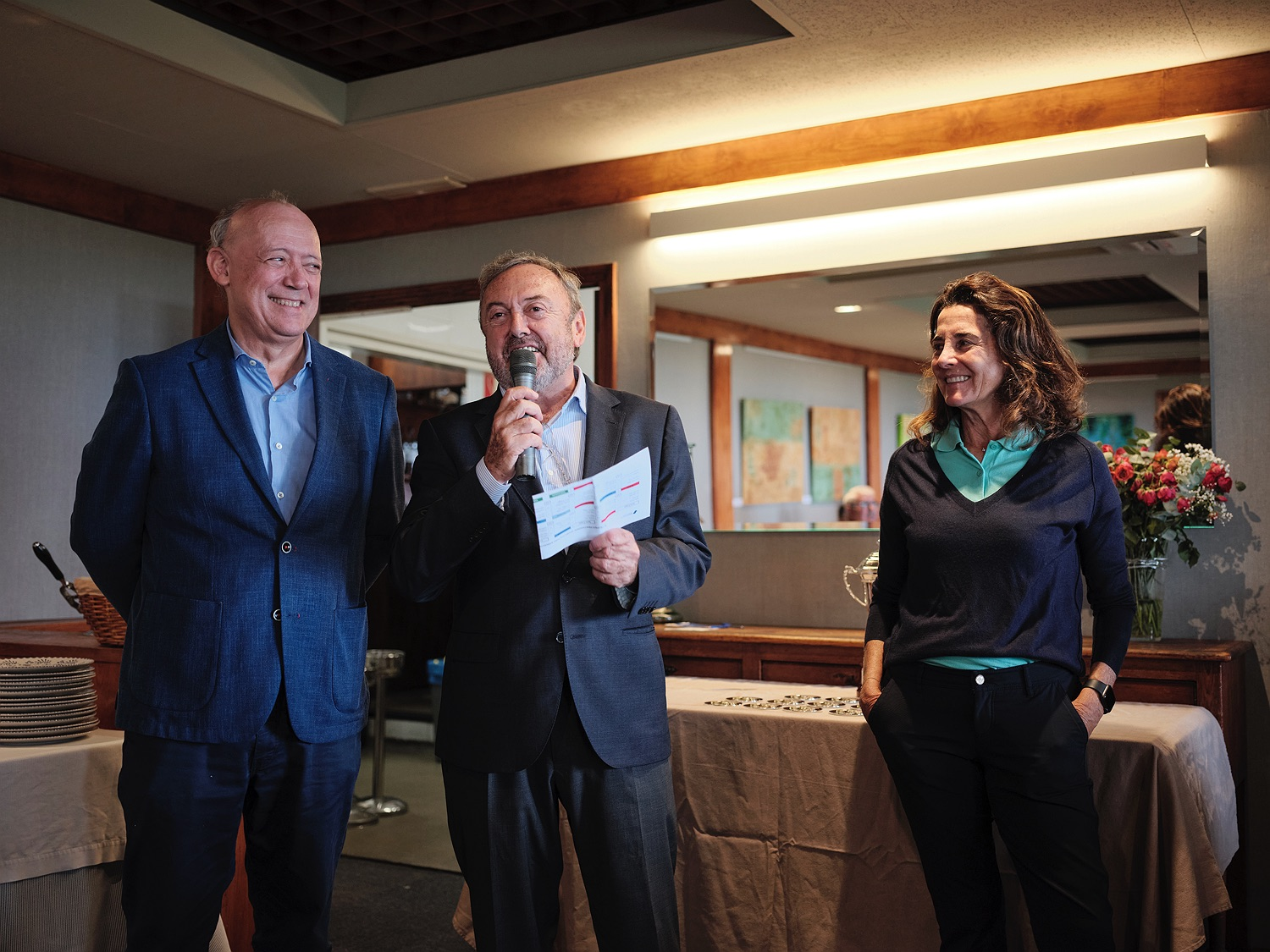La capitana del equipo del Real Club de Golf El Prat, Nuria Araquistain, recibió el trofeo de manos de Juan Camprubí, presidente del Club de Golf Llavaneras, y Josep Mateu, presidente de Sport Cultura Barcelona.