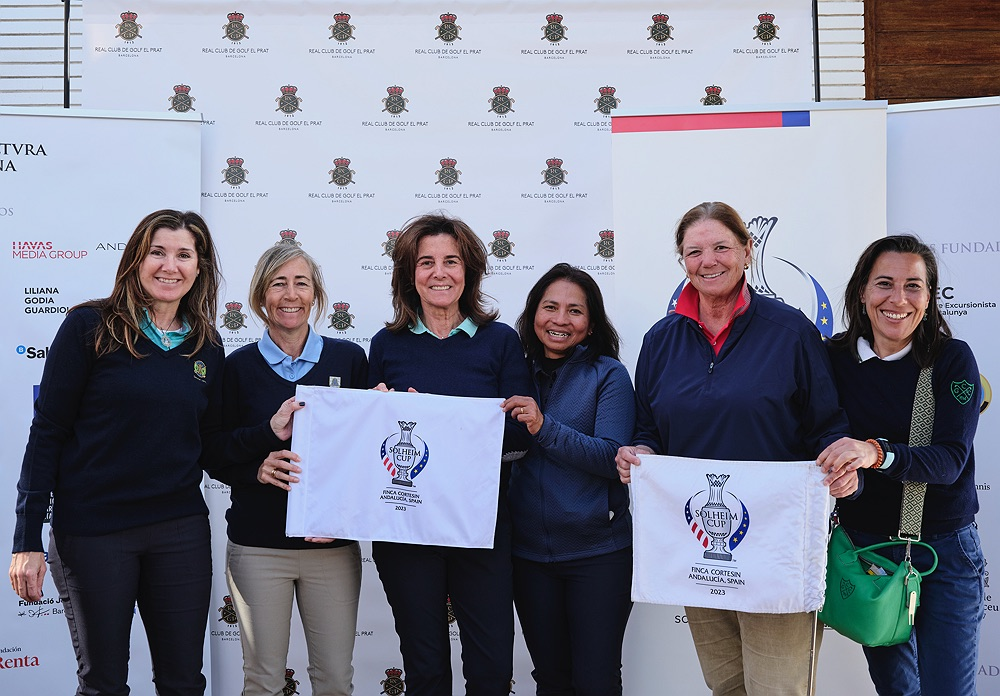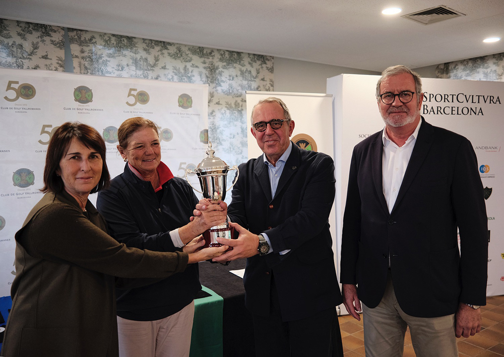 El presidente del Real Club de Golf El Prat, Pancho Schröder, y la capitana de su equipo, Nuria Araquistain, recibieron el trofeo de manos de Carlota Sabaté, presidenta del Club de Golf Vallromanes, y Albert Agustí, presidente de Sport Cultura Barcelona.